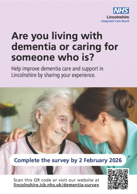 Lincolnshire Integrated Care Board (ICB) is inviting people to take part in this survey to help improve care and support for individuals affected by dementia. Your feedback will help us understand experiences, identify what is working well, and highlight where improvements are needed. By sharing your views, you will play an important role in shaping better, more responsive dementia services across Lincolnshire. Please scan the QR code or visit the website.